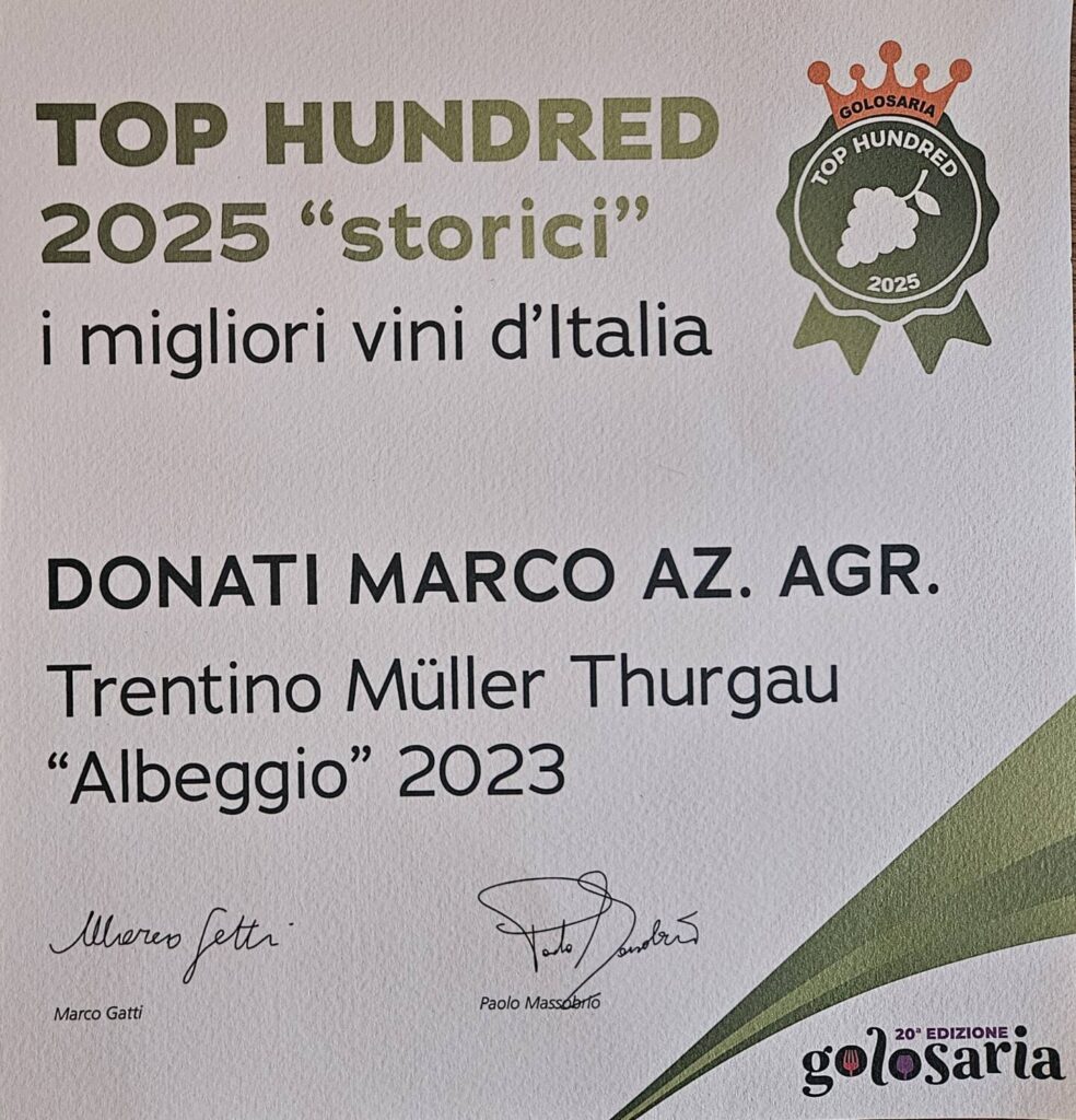 E’ con grande piacere che vi comunichiamo che il nostro Muller Thurgau Albeggio 2023 è stato premiato TOP HUNDRED, tra i Miglior 100 Vini d’Italia dalla Guida Golosario di Paolo Massobrio e Marco Gatti.